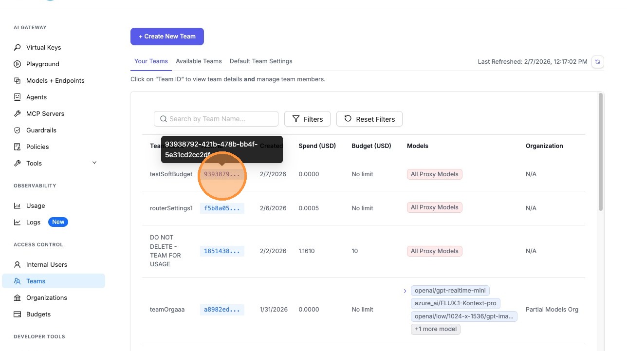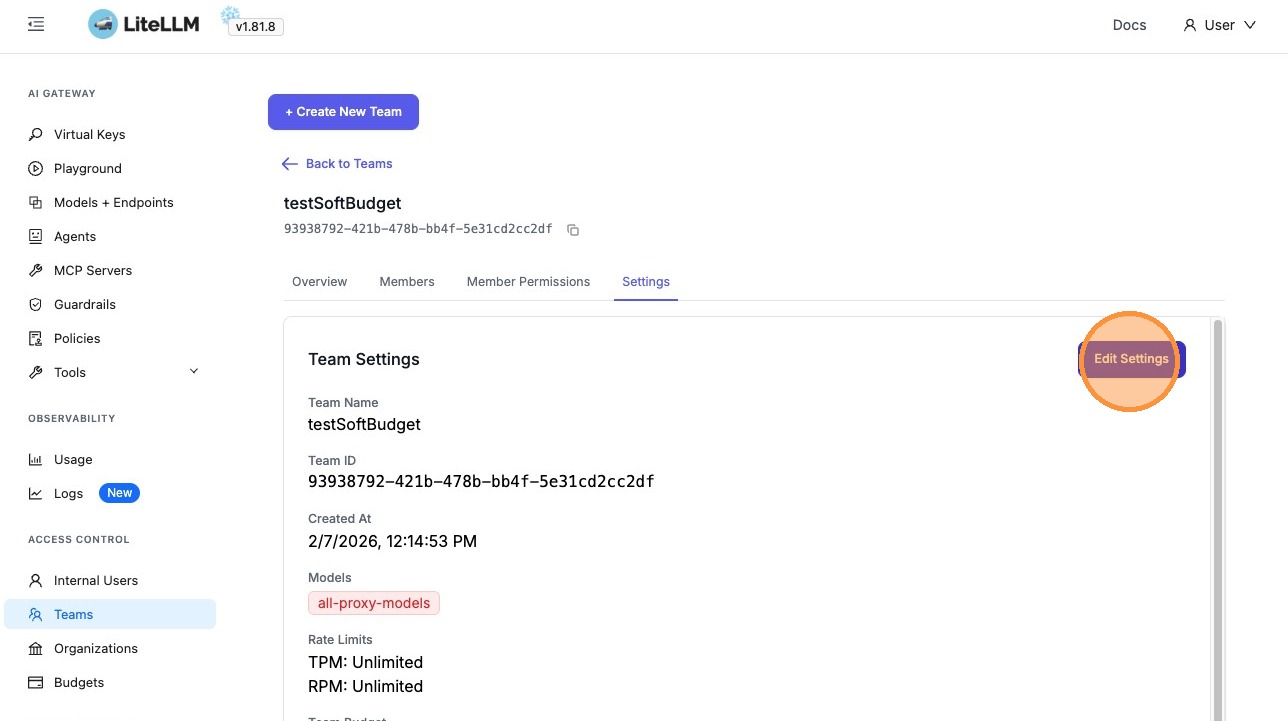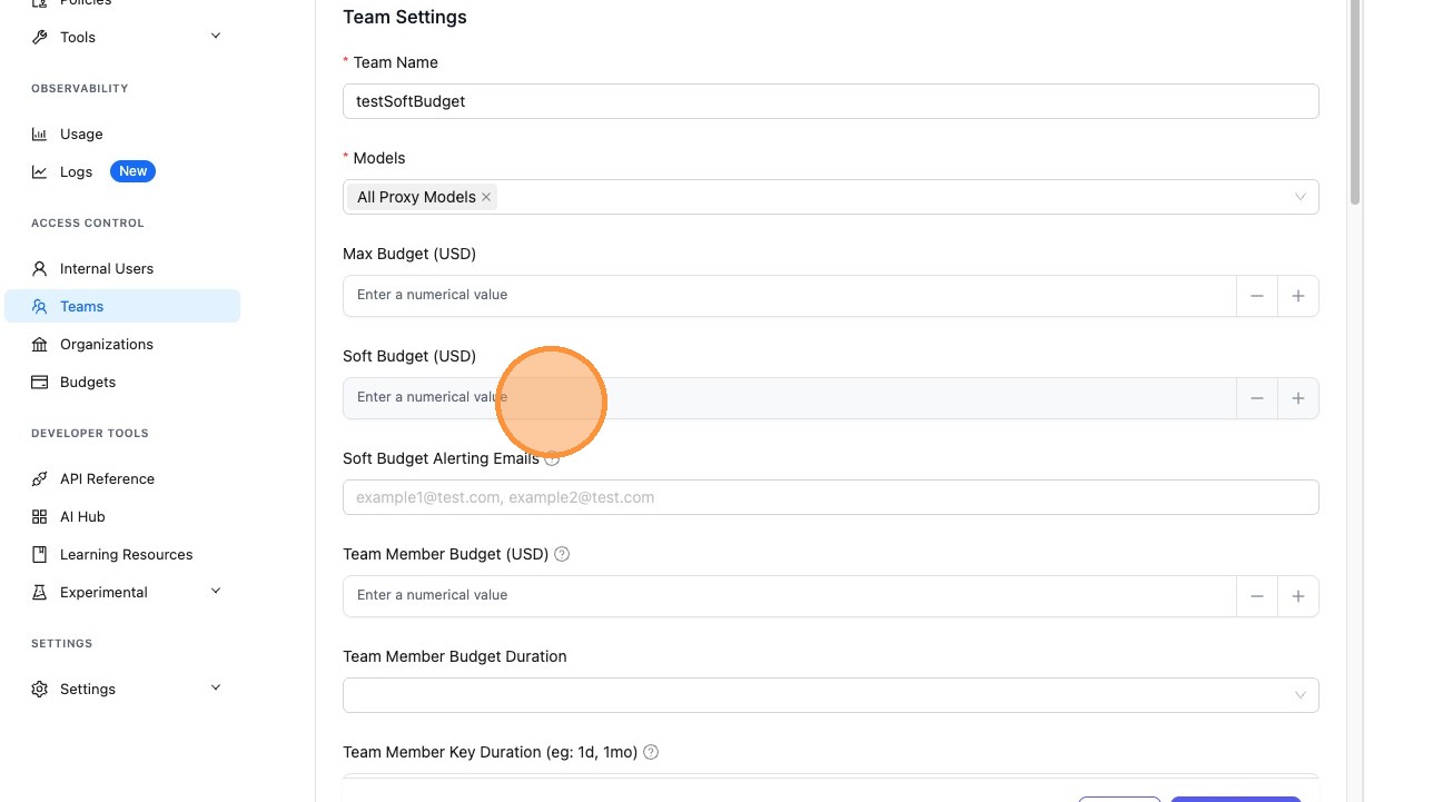 - Get notified early — receive email alerts when a team's spend crosses the soft budget threshold