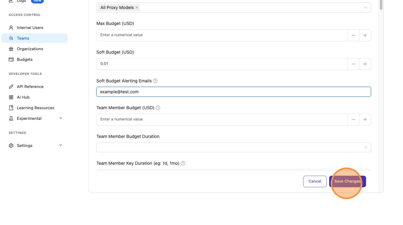 Click Save Changes. The soft budget alert is now active — no proxy restart required.